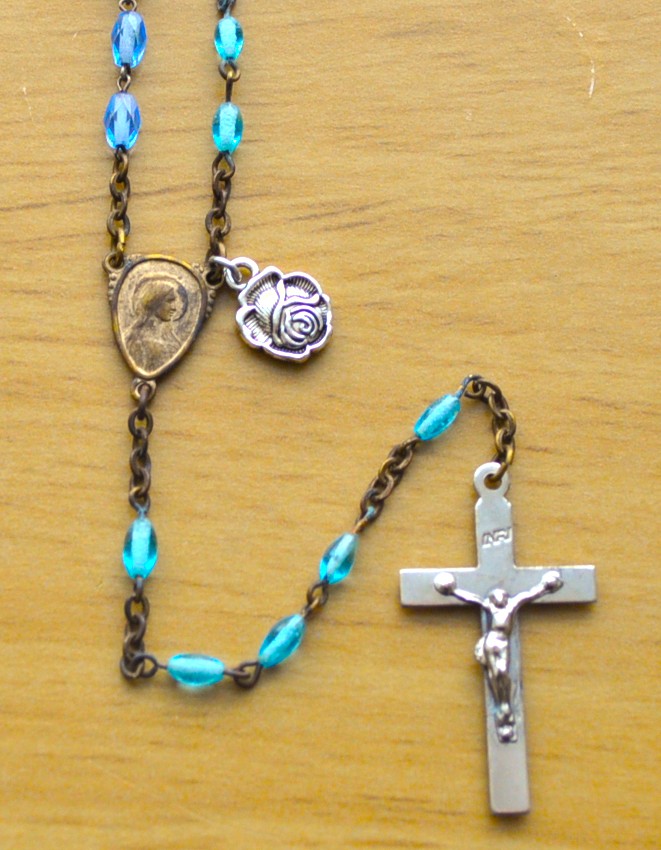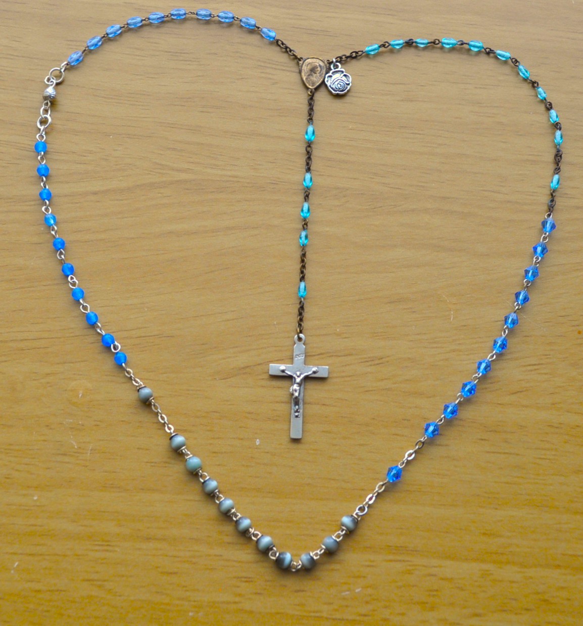 Lourdes, France (aqua), La Salette, France (diamond), Guadalupe, Mexico (gray), Fatima, Portugal (round), Paris, France (blue barrel).
