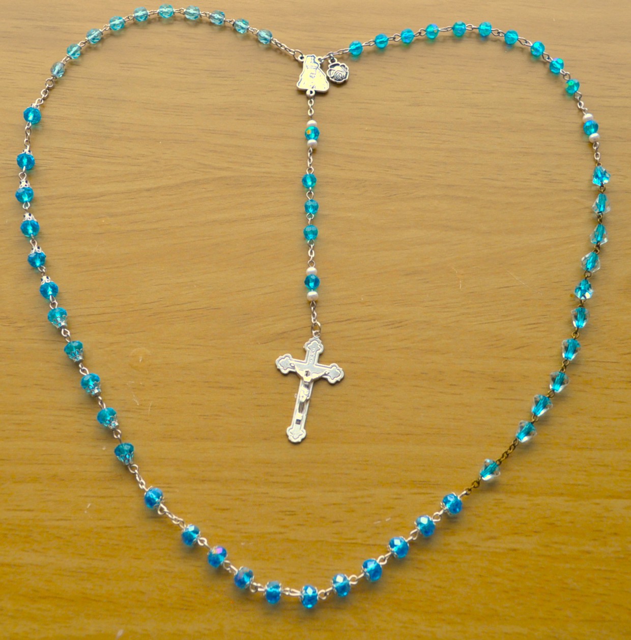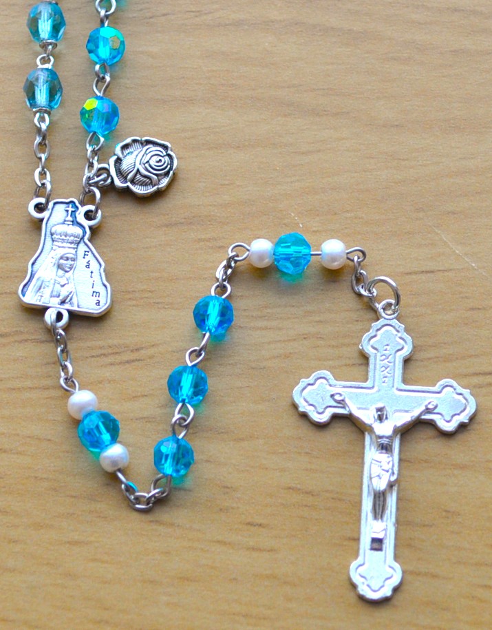 Fatima, Portugal (dark round), Gietrzwald, Poland (tri cone), Lourdes, France (oval), Knock, Ireland (single cap), La Salette, France (light round).