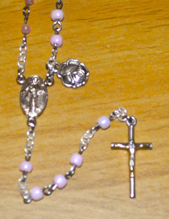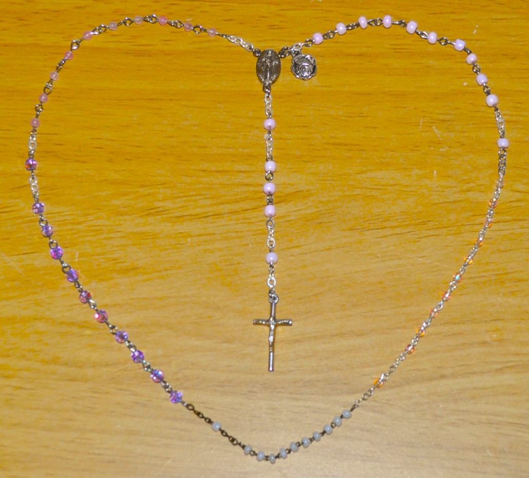 Medjugorje, Yugoslovia (large pink), Lourdes, France (clear), Rome, Italy (white), Paris, France (purple), Fatima, Portugal (small pink).