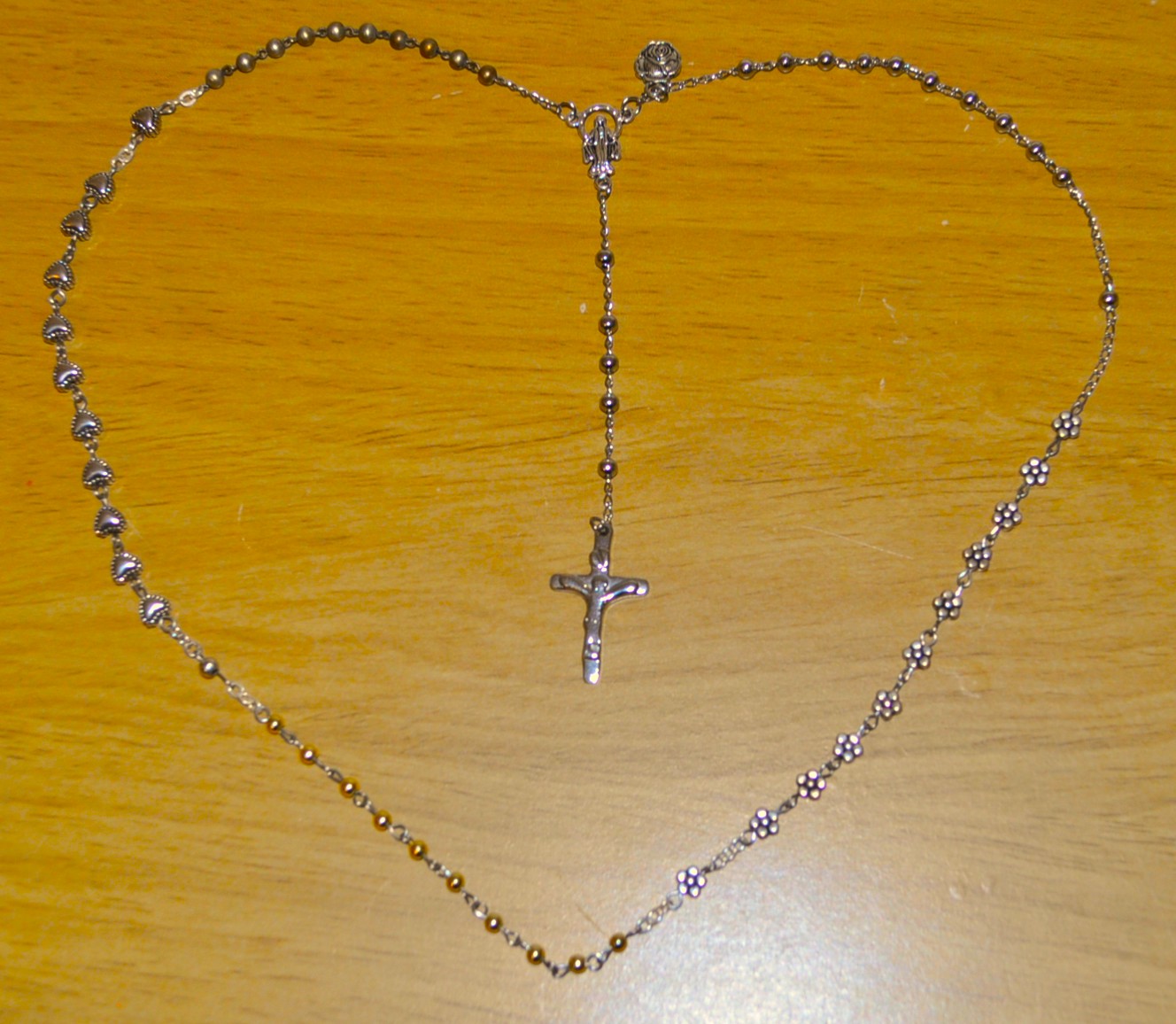 Paris, France (small silver), Lourdes, France (flower), Rome, Italy (gold), La Salette, France (heart), Fatima, Portugal (large silver).