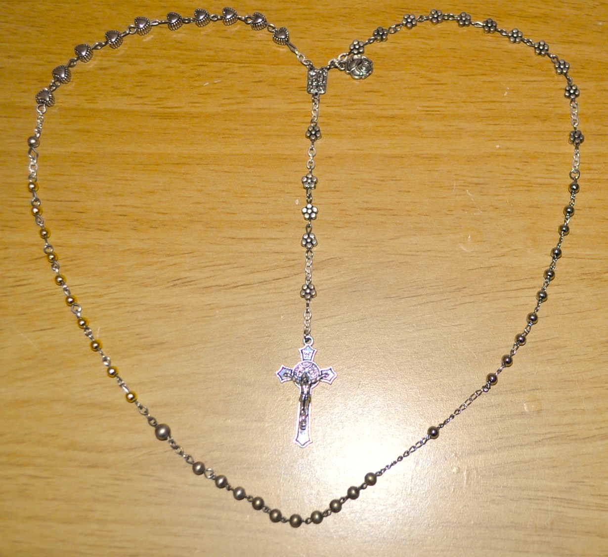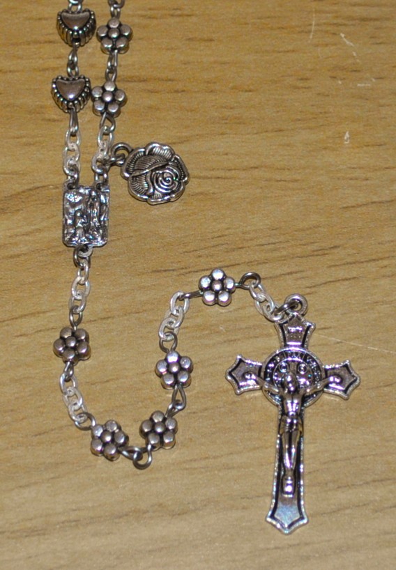 Lourdes, France (flower), Paris, France (small silver), Fatima, Portugal (large silver), Rome, Italy (gold), La Salette, France (heart).
