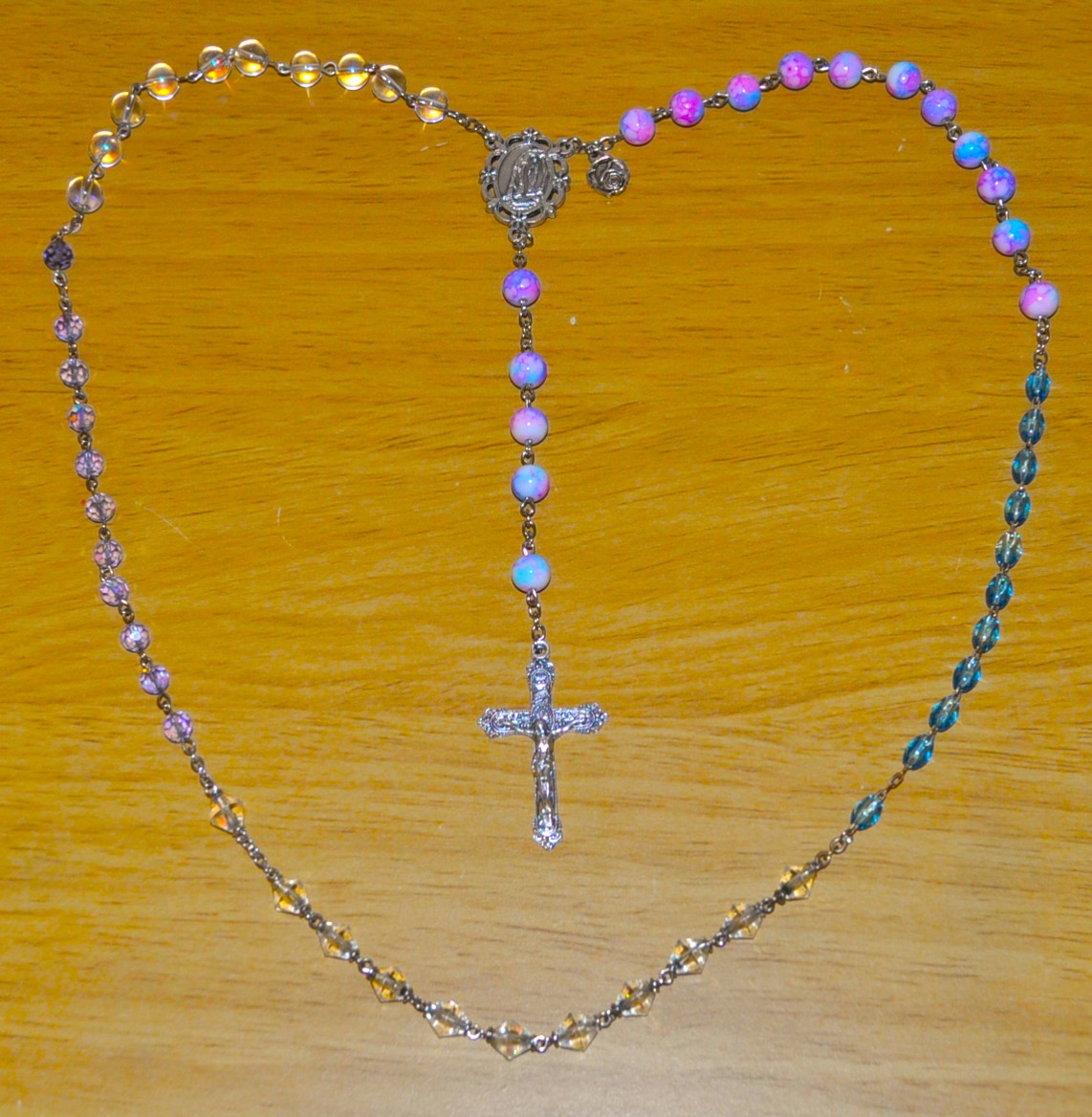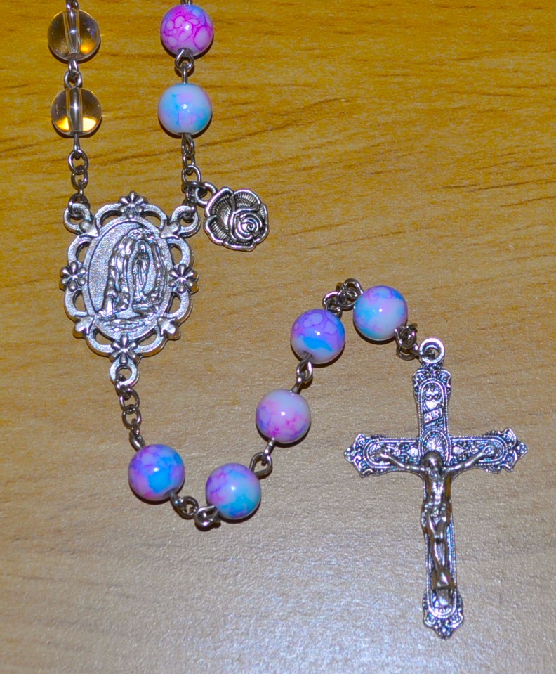 Lourdes, France (multi), La Salette, France (blue), Rome, Italy (diamond), Paris, France (purple), Guadalupe, Mexico (clear round).