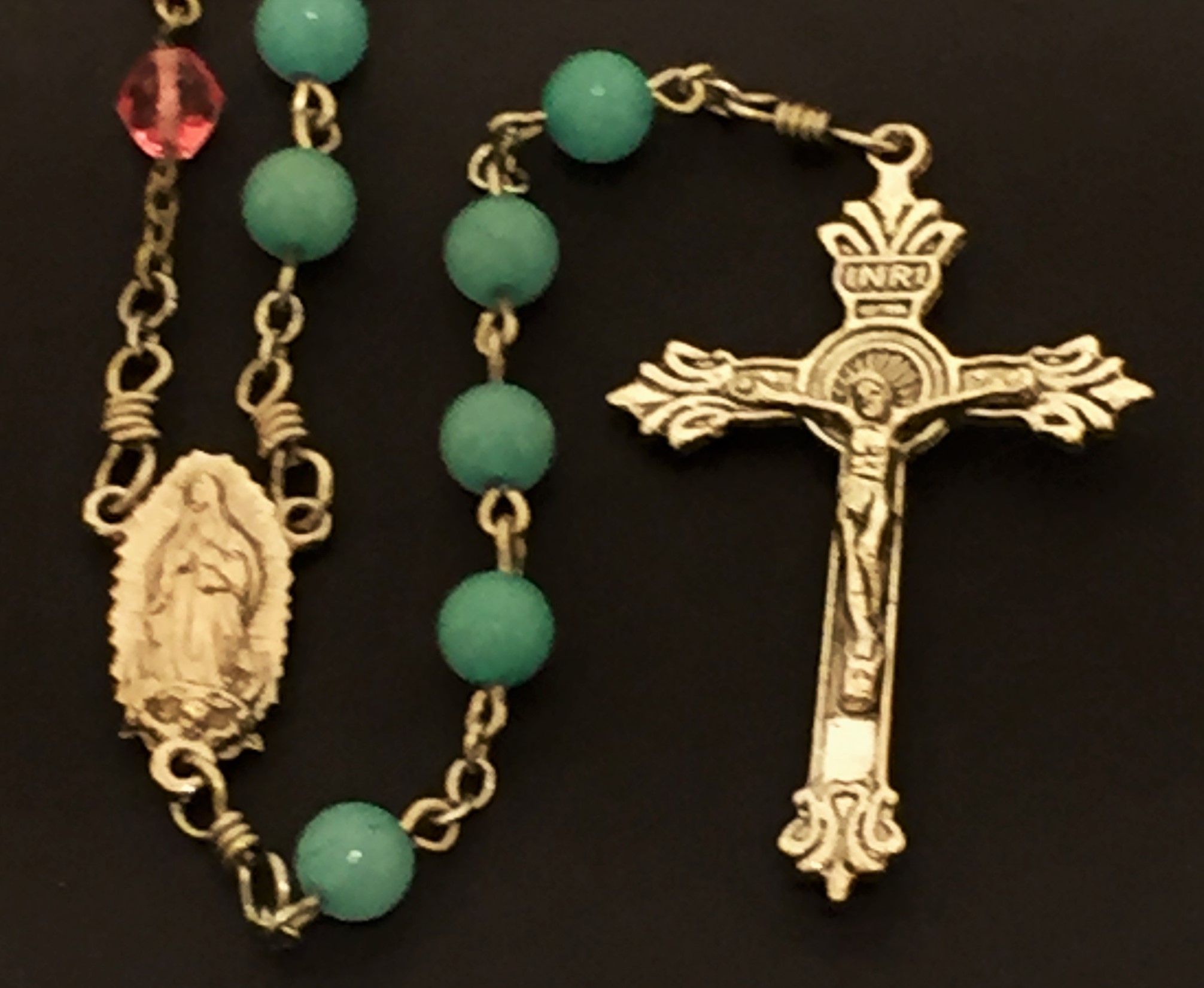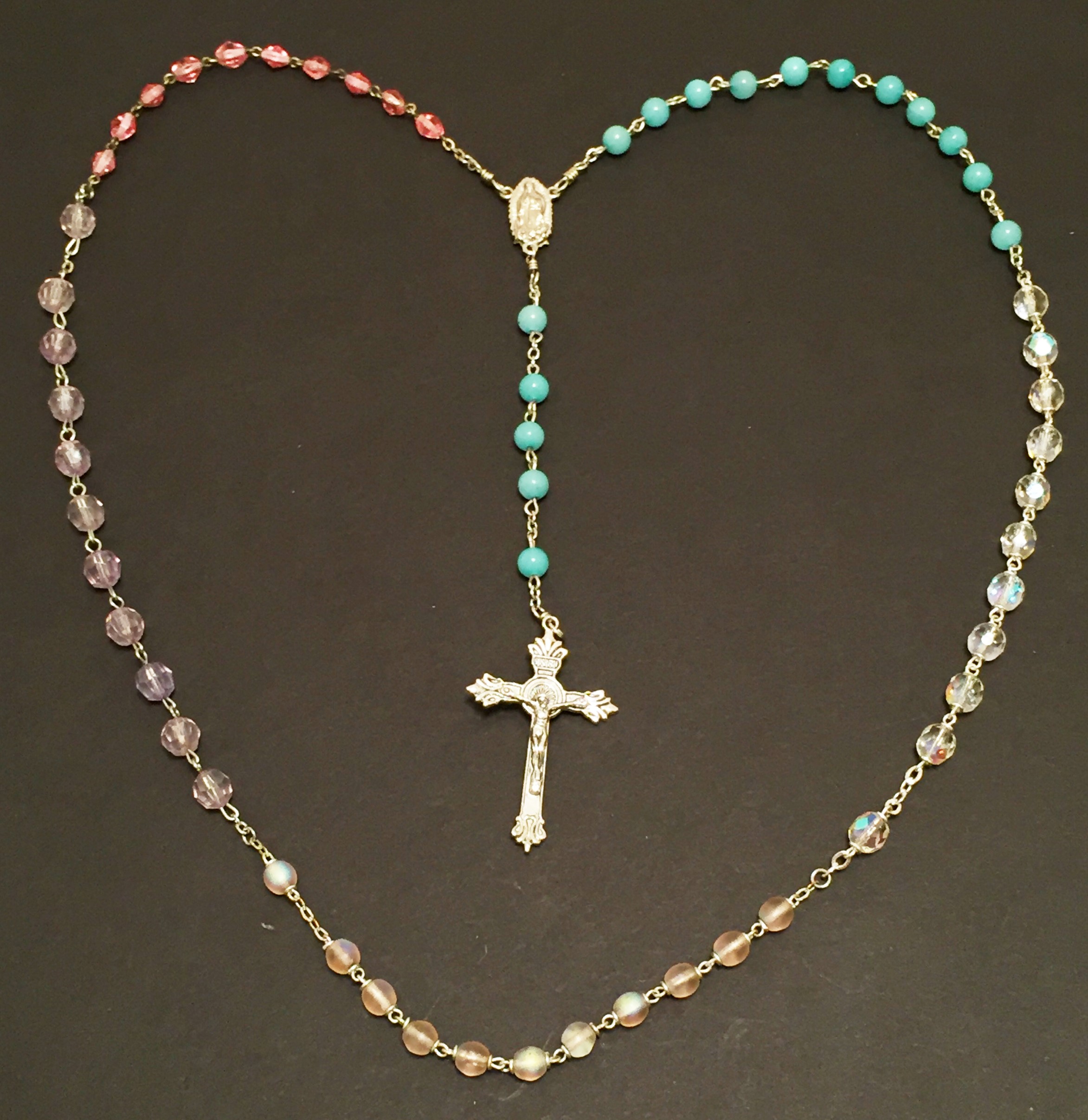 A devotional Marian Apparition rosary with a decade of beads from five separate apparition sites. This rosary includes beads from the following apparition sites: cross and fist decade Guadalupe, Mexico (aqua), followed by Fatima, Portugal (clear), La Salette, France (pale pink), Lourdes, France (pale lavender), Paris, France, (dark pink).