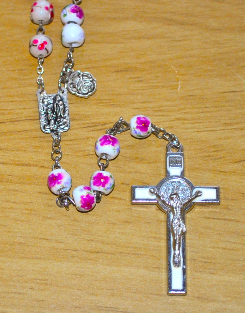 Lourdes, France (fuchsia), Fatima, Portugal (blue), La Salette, France (yellow), Paris, France (purple), Rome, Italy (pink).