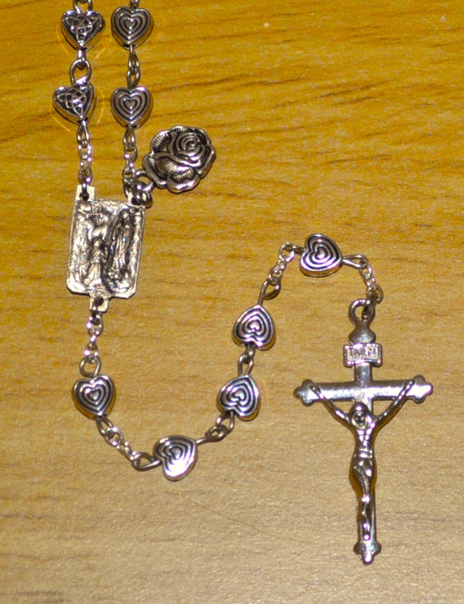 Lourdes, France (lined heart), Medjugorje, Yugoslovia (small rose), Rome, Italy (round), Paris, France (flower), Fatima, Portugal (celtic).