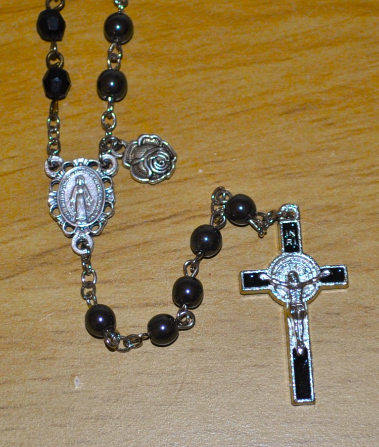 Paris, France (round hematite), Rome, Italy (wood barrel), Knock, Ireland (round), Fatima, Portugal (oval hematite), La Salette, France (faceted).
