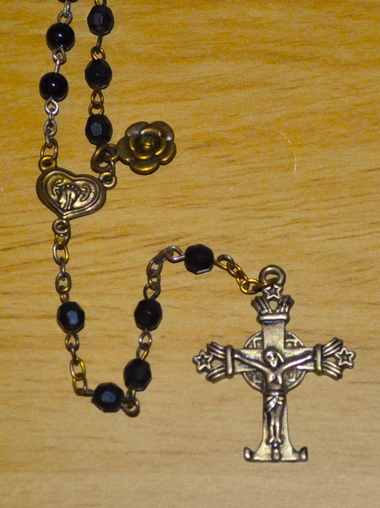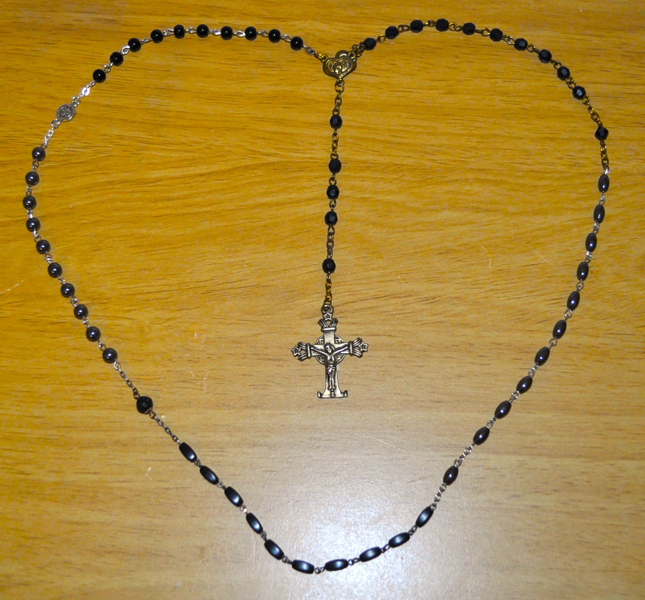 La Salette, France (faceted), Fatima, Portugal (barrel hematite), Rome, Italy (wood barrel), Paris, France (round hematite), Knock, Ireland (round).