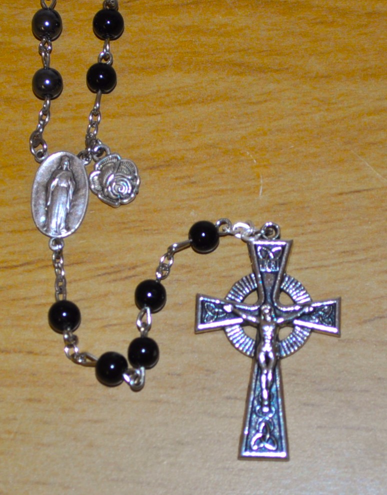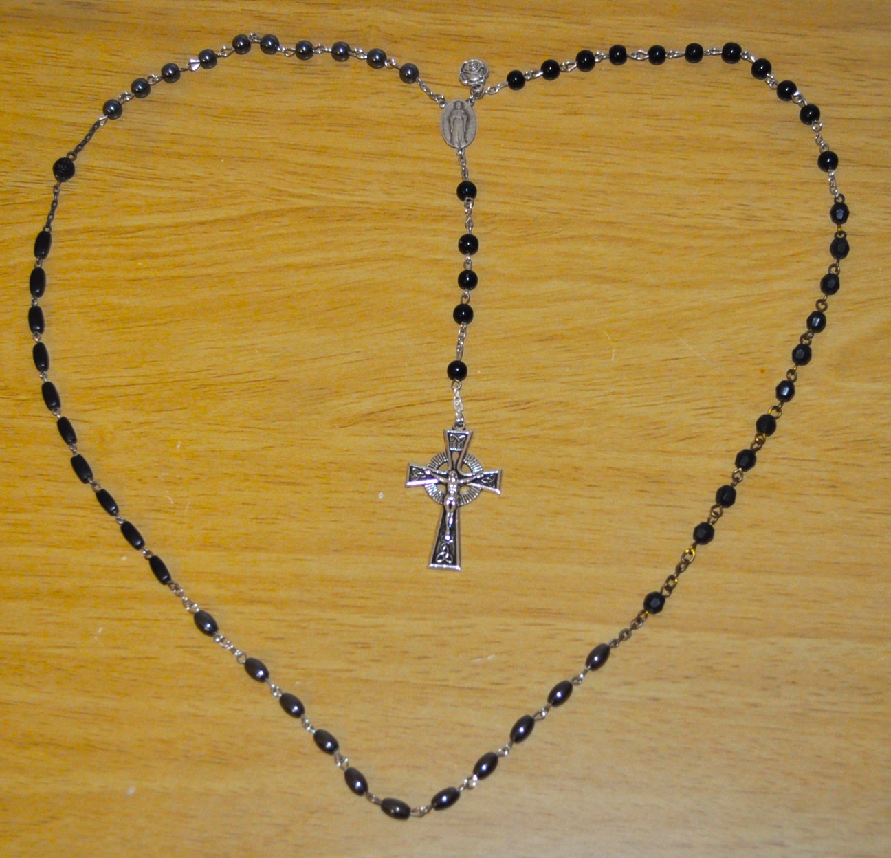 Knock, Ireland (round), La Salette, France (faceted), Fatima, Portugal (oval hemartite), Rome, Italy (wood barrel), Paris, France (round hematite).