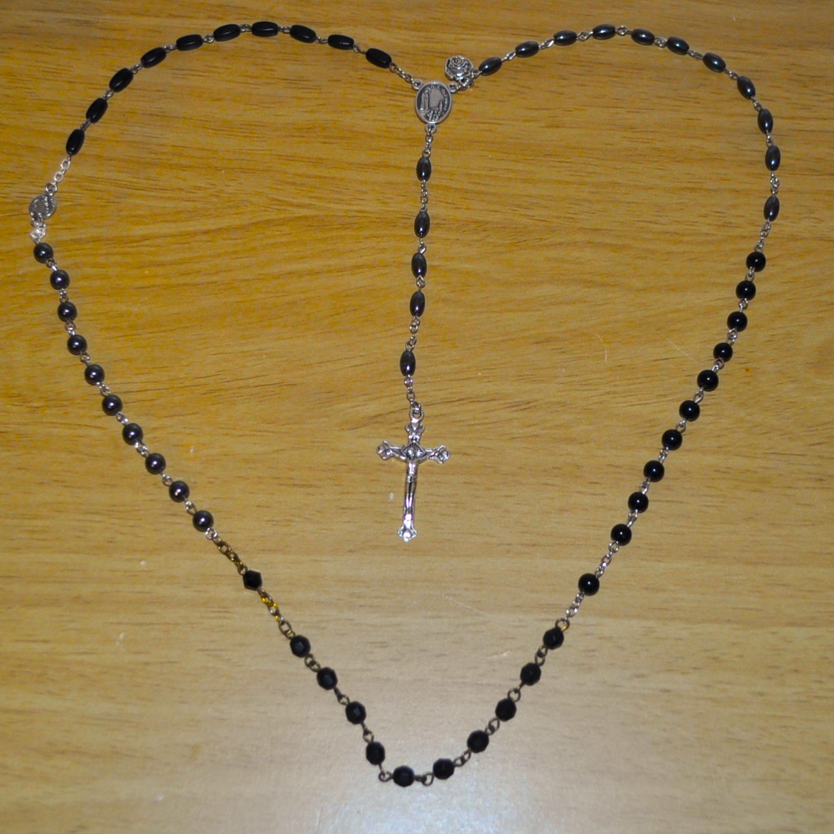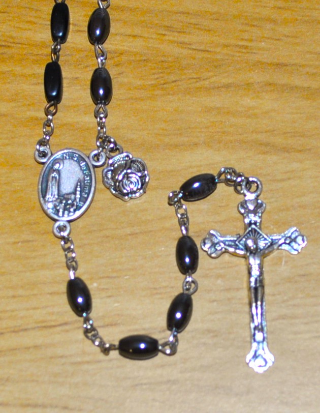 Fatima, Portugal (oval hematite), Knock, Ireland (round), La Salette, France (faceted), Paris, France (round hematite), Rome, Italy (wood barrel).