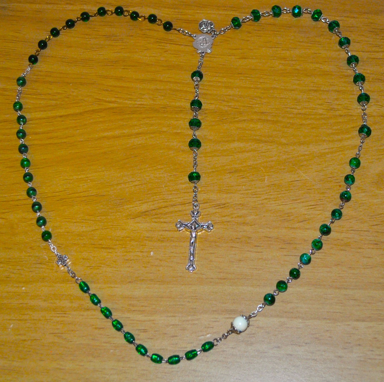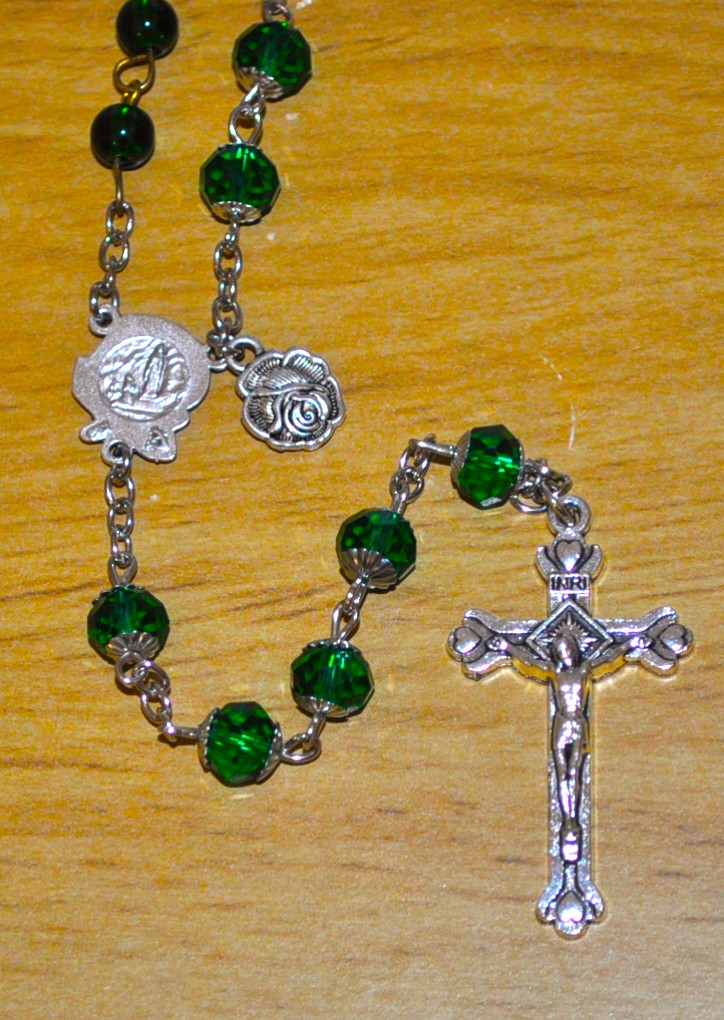 Lourdes, France (crystal), Knock, Ireland (black/green), Guadalupe, Mexico (barrel), Rome, Italy (cats eye), Fatima, Portugal (clear).
