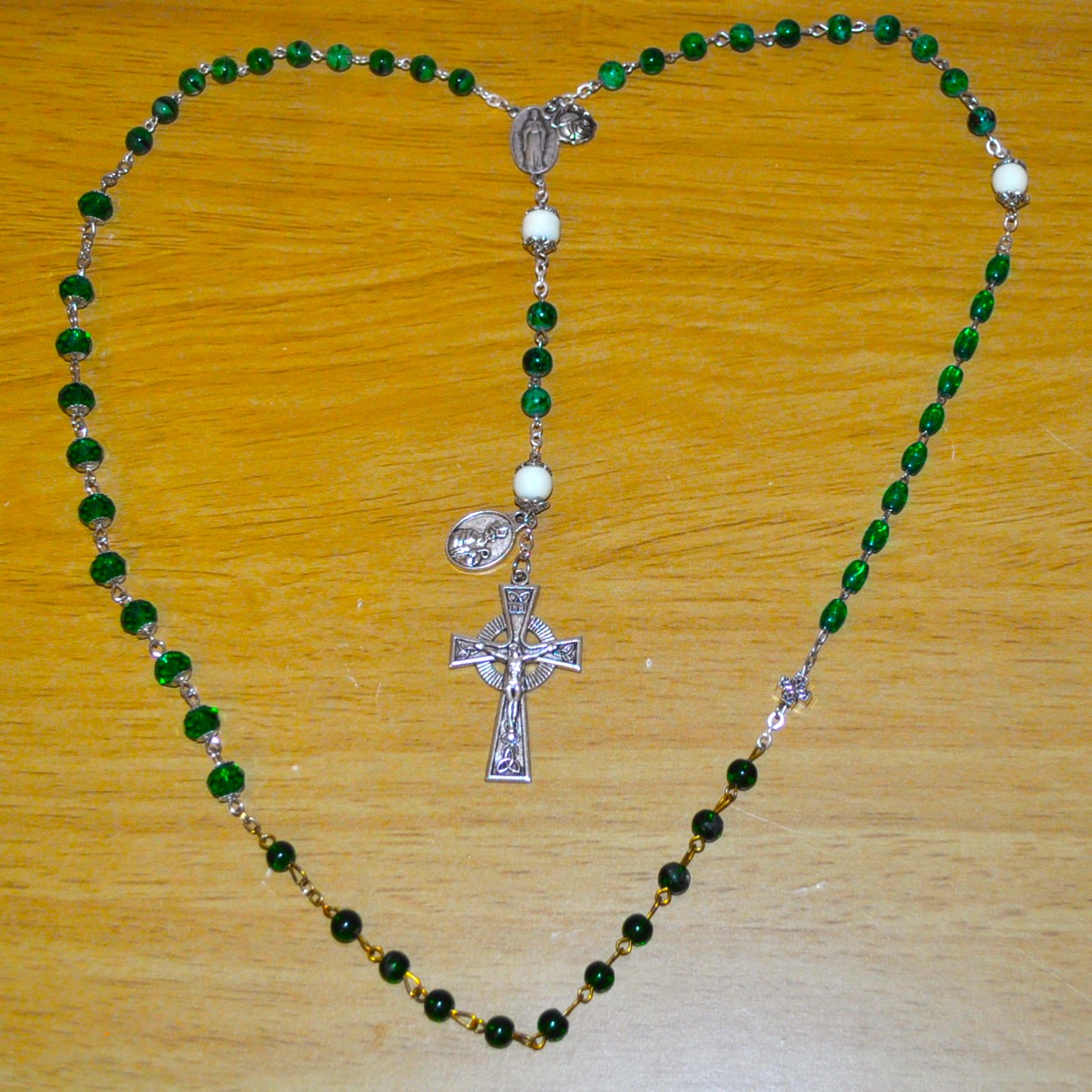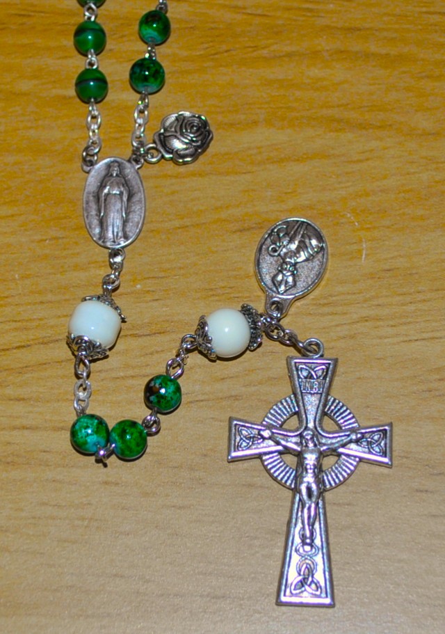 Knock, Ireland (black/green), Guadalupe, Mexico (barrel), Fatima, Portugal (clear), Lourdes, France (crystal), Rome, Italy (cats eye).