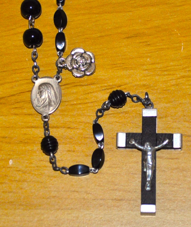 La Salette, France (barrel), Fatima, Portugal (hematite), Knock, Ireland (black/white), Paris, France (hematite/coin), Rome, Italy (black).
