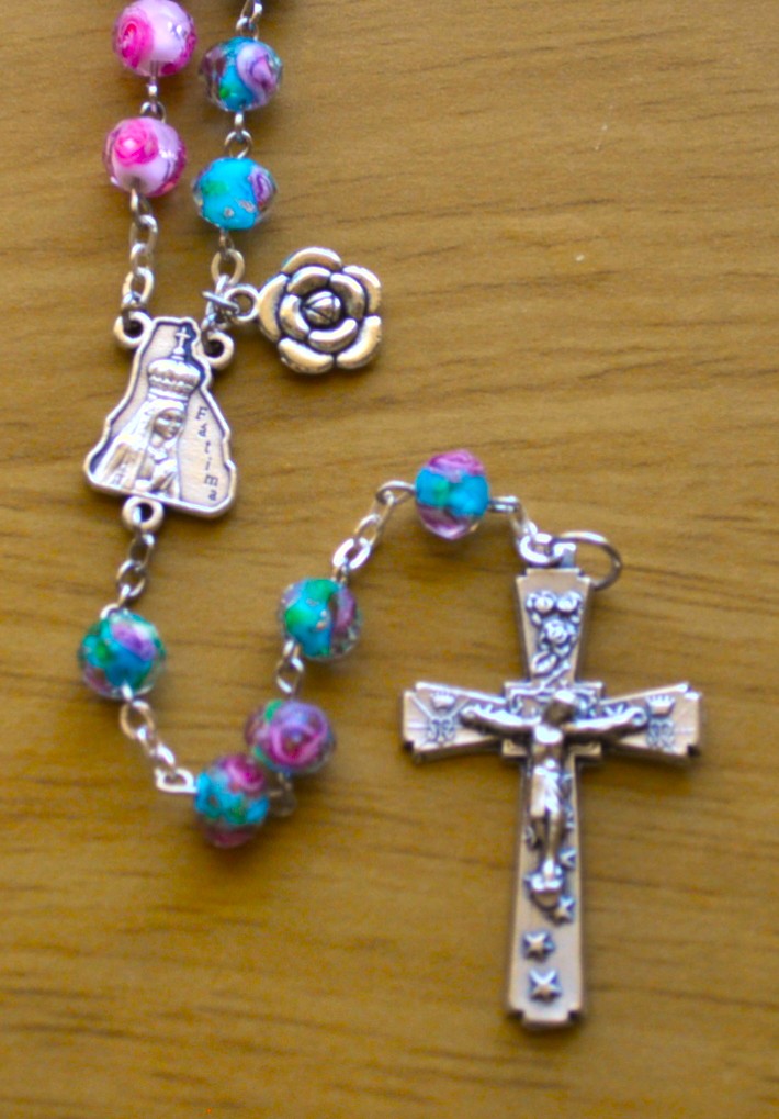Fatima, Portugal (light blue), Guadalupe, Mexico (black), Knock, Ireland (aqua), Lourdes, France (navy), Paris, France (pink).