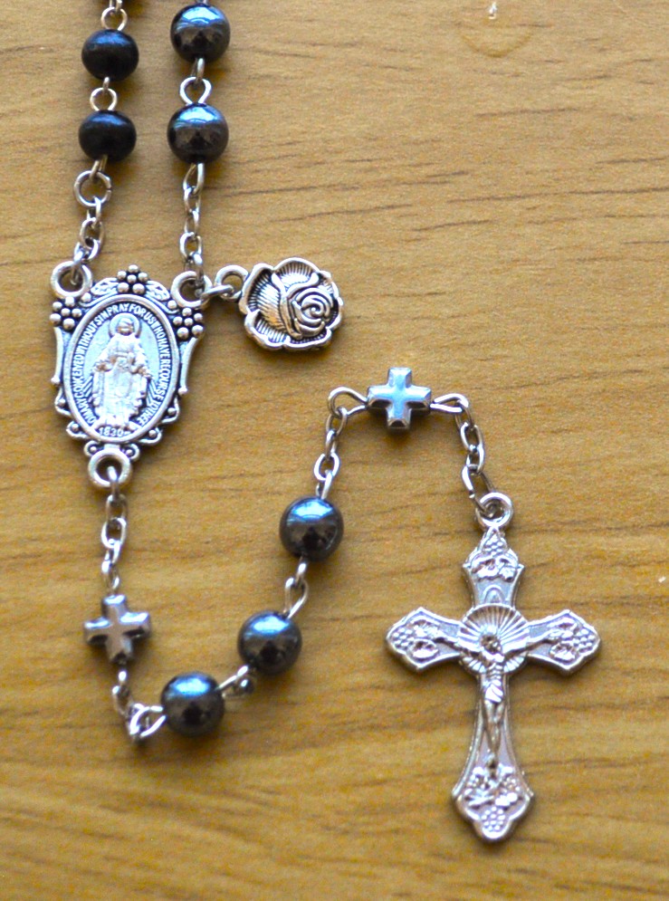 Paris, France (hematite), Knock, Ireland (barrel), La Salette, France (small), Fatima, Portugal (faceted), Rome, Italy (oval).