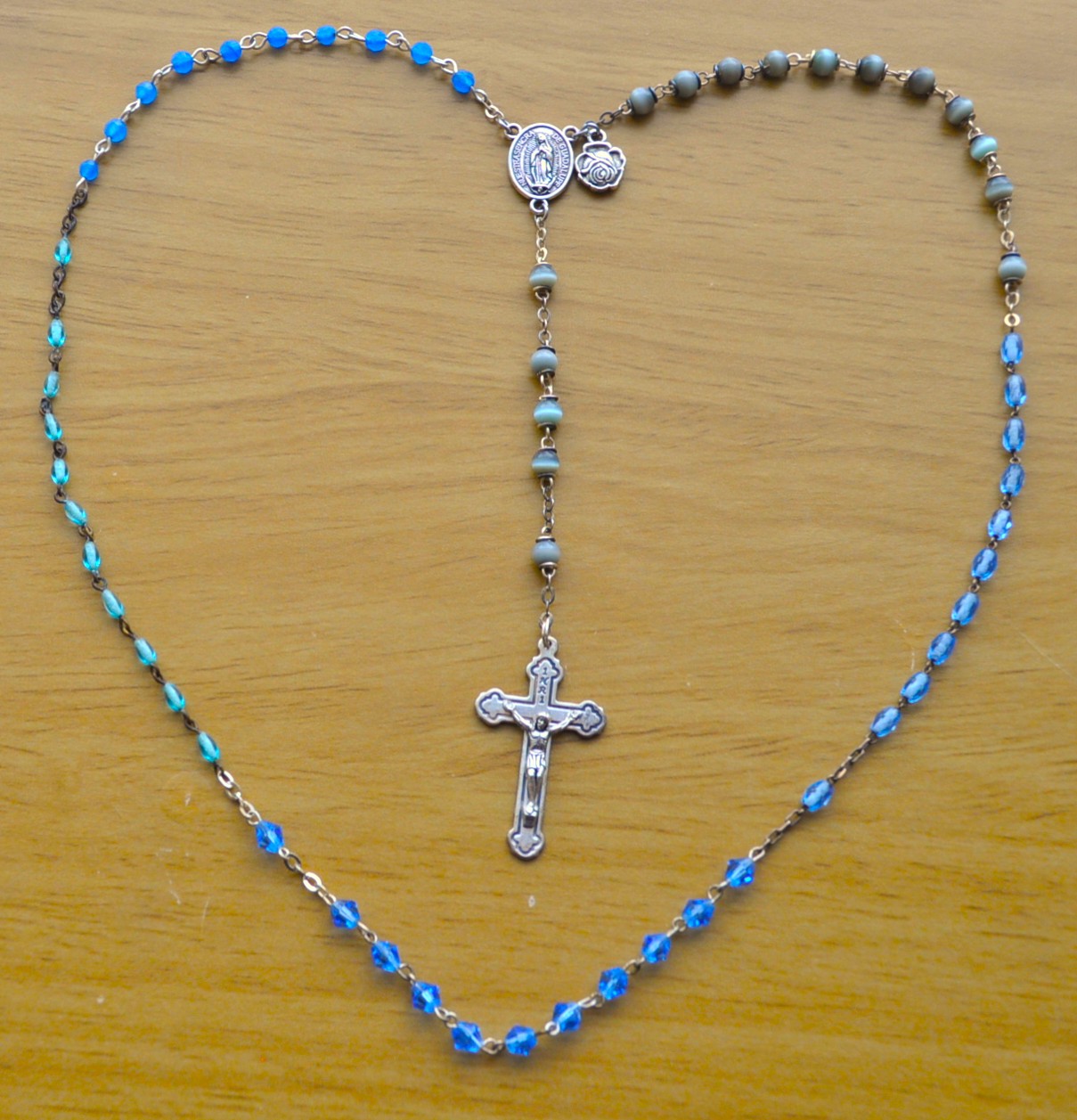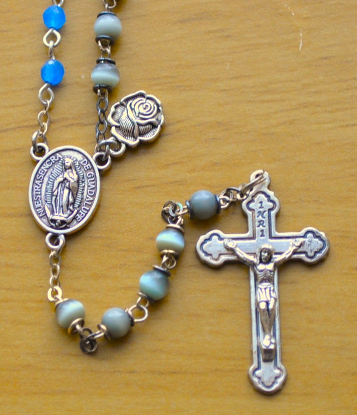Guadalupe, Mexico (gray), Paris, France (blue barrel), La Salette, France (diamond), Lourdes, France (aqua), Fatima, Portugal (round).